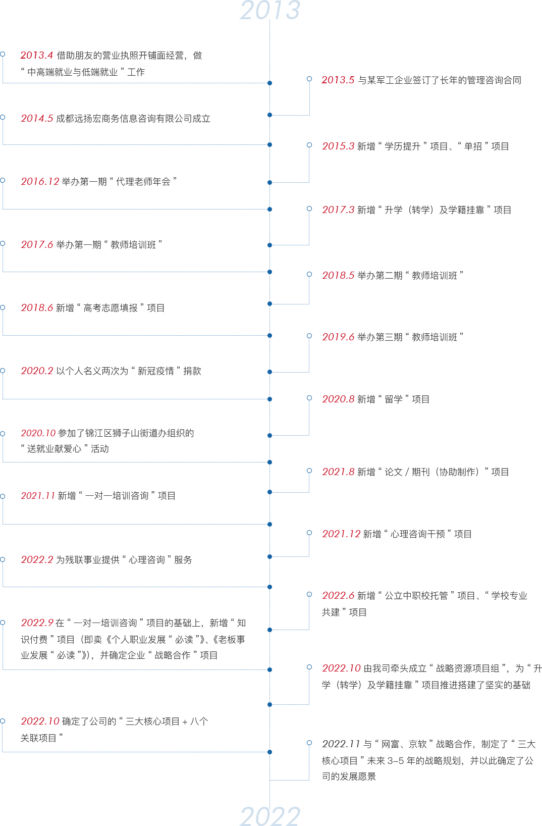 将公司真正打造为“升学+就业+职业(事业)发展”的一站式服务平台,为学生“多读书、读好书”、为求职者“能就业、就好业”、为职场人“爱情事业双丰收”助力、为企业“多快好省地挣钱”助力,以便最终让企业名声远扬、让客户前程似锦、让老板持续盈利!