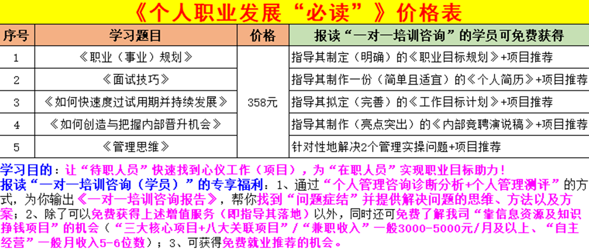 “待职、在职”人员通过购买《个人职业发展“必读”》与参加“一对一培训咨询”,让“待职人员”快速找到心仪工作(项目),为“在职人员”实现职业目标助力。回归“中高端就业”的初衷,既帮助求职者找到“心仪工作”(并确定明确的职业目标规划),更帮助其在单位持续稳定地发展并实现其职业目标助力!