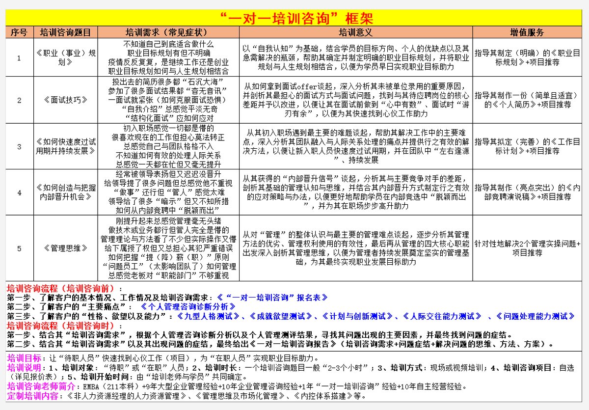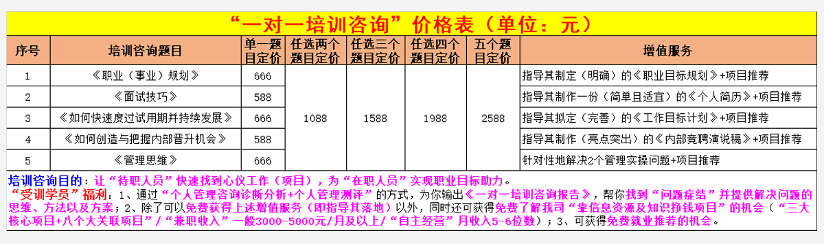 如果你已系统地学完《个人职业发展“必读”》,如果你还有“管理困惑”,如果你还想针对性地帮你“落地”请报读“一对一培训咨询”!“一对一培训咨询”,为你“快速找到心仪工作”、“早日度过试用期”、“把握晋升机会步步高升”、“提升管理水平稳步发展”、“早日拟定并实现职业目标”等助力!