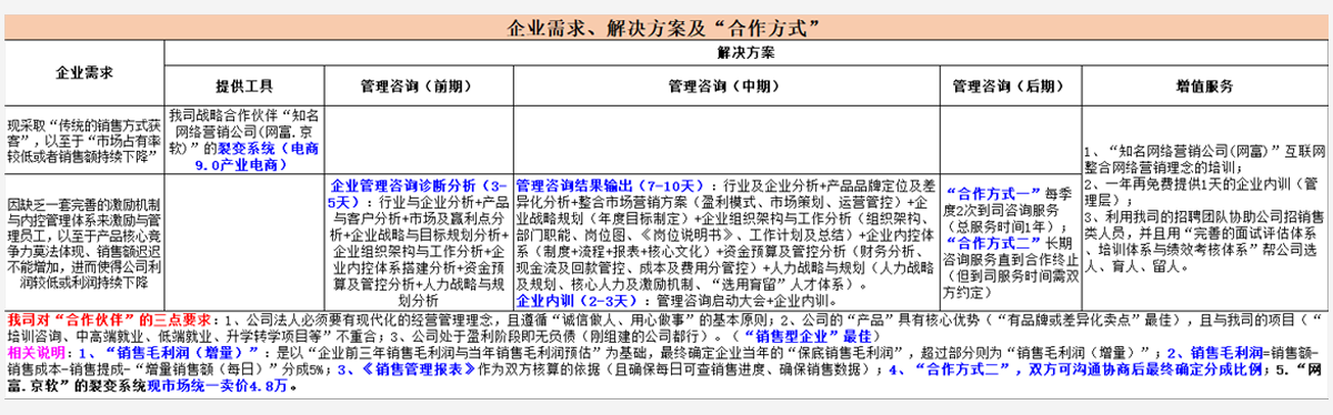 “企业战略合作(企业管理咨询)”除了直接购买“网富.京软的裂变系统(电商9.0产业电商工具)+整套管理咨询方案”以外,还可以将管理咨询费用直接与企业的“增量销售额与增量销售毛利润”挂钩,开创了管理咨询行业的先河!除了帮助企业解决“经营管理难”的问题,同时还帮助企业解决“获客难、招人与留人难”的问题!